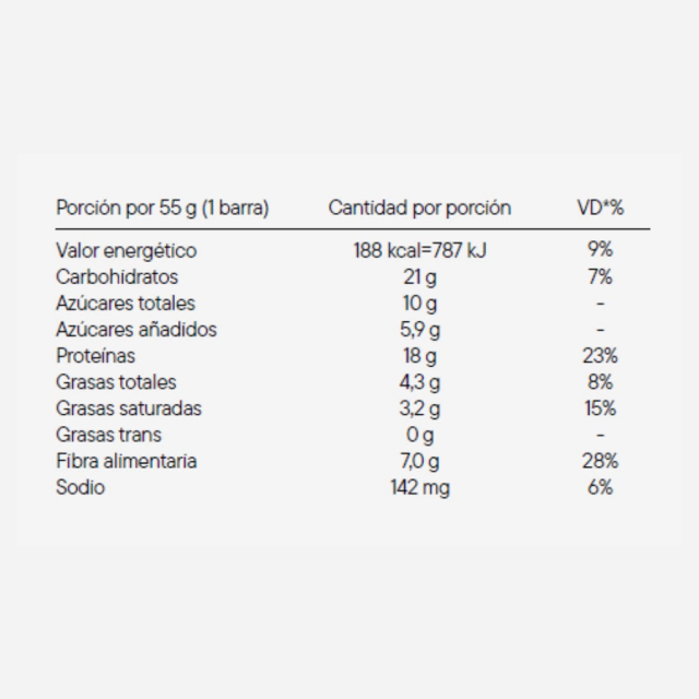 o Ingredientes: Crispín proteico de soja, baño de repostería semiamargo, mosto de uva, inulina, proteina de soja texturizada, crispín de arroz, pasta de maní, proteína de soja, cúrcuma.