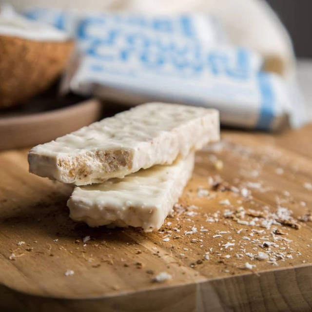 Barrita de arroz cubiertas de crema de coco con semillas de amaranto, chía y sésamo.