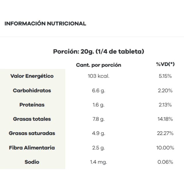 o Calorías: 103 kcal por porción (20g, 1/4 tableta)