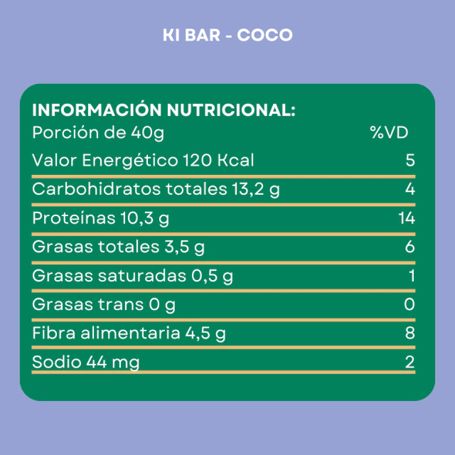 BARRA PROTEICA KI BAR COCO NATURAL 40G: dátiles, albúmina de huevo deshidratada, maní tostado sin sal, agua, almendras, coco rallado y castañas de cajú.