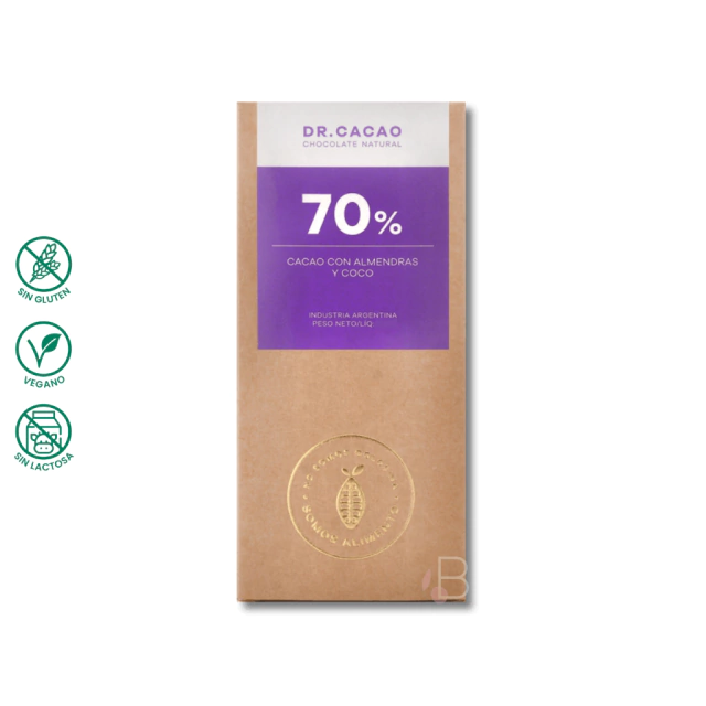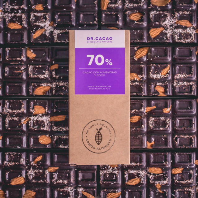 TABLETA CHOCOLATE 70% CACAO CON ALMENDRAS Y COCO 50G