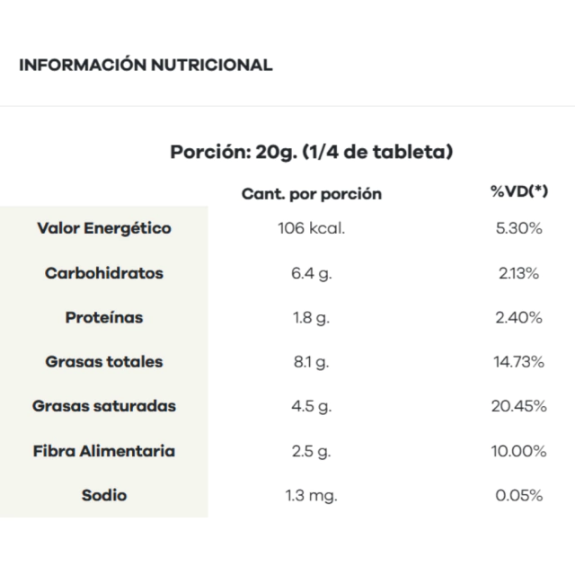 o Calorías: 106 kcal por porción (20g, 1/4 tableta)