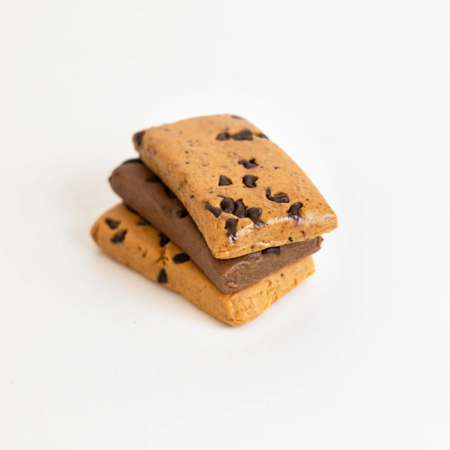 BARRA PROTEICA POST WORKOUT BIGUAL CAFÉ 50 G: pasta de maní, clara de huevo deshidratada, endulzada con miel, chips de chocolate blanco y cacao amargo.