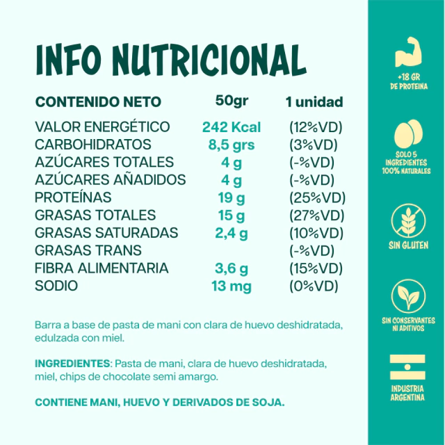 o Ingredientes: pasta de maní, clara de huevo deshidratada, endulzada con miel y chips de chocolate semi amargo.