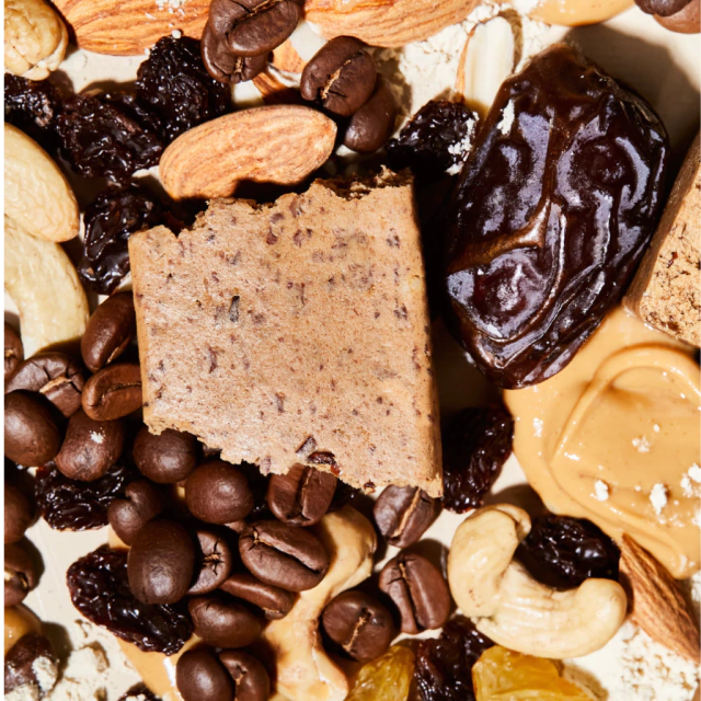 o Ingredientes: Proteína vegetal, dátiles, pasas de uva, pasta de maní, texturizado de arvejas y esencia natural de café