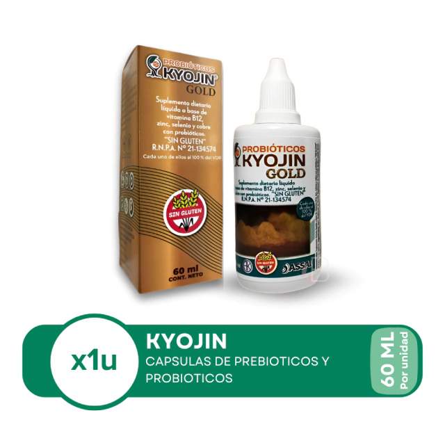 KYOJIN Gold es un suplemento dietario líquido que combina probióticos con micronutrientes esenciales. Contiene 1000 millones de unidades formadoras de colonias de Bacillus subtilis DG101 (100% de la ingesta diaria recomendada), junto con vitamina B12, zinc, selenio y cobre. Esta fórmula integral está diseñada para contribuir al equilibrio de la microbiota intestinal y al mismo tiempo apoyar el sistema inmune, el metabolismo energético y la protección celular frente al estrés oxidativo.