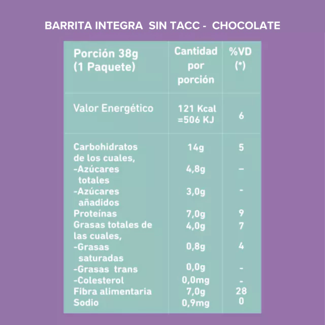 Barrita semillas y chocolate: Trigo sarraceno, proteína vegetal texturizada, fibra de la raíz de achicoria (inulina), almibat de azúcar mascabo, maní, almendra, amaranto inflado, chips de chocolate semiamargo, semillas de girasol, semillas de chía, cacao en polvo y aromas