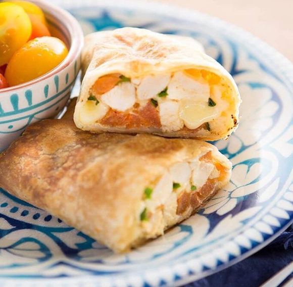 o Ingredientes: Wrap de pollo, tomate, queso en hebras, queso crema y albahaca.